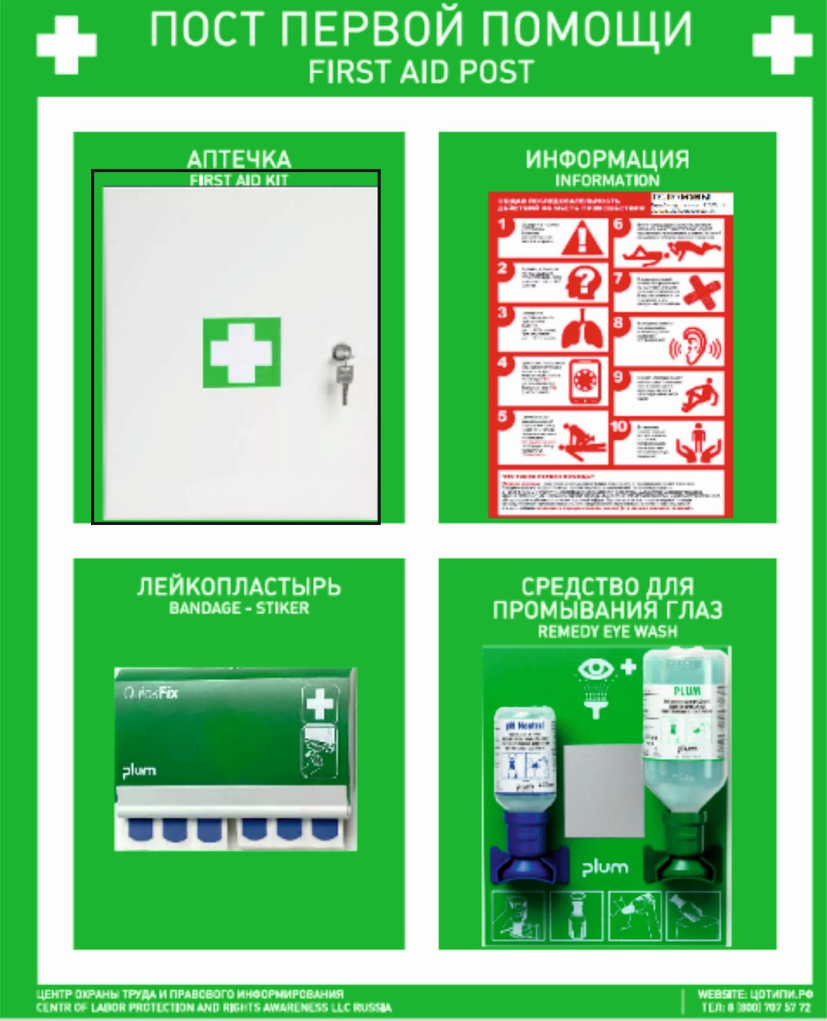 Стенд первой помощи — это специально оборудованное место, где собраны все необходимые средства для оказания доврачебной помощи при травмах, несчастных случаях или внезапных заболеваниях.